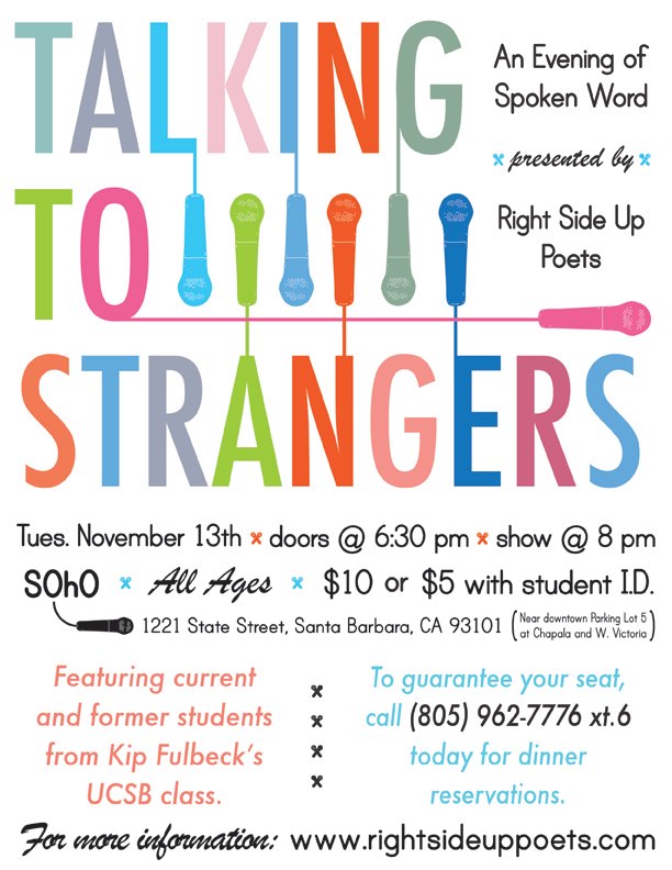 Life SOHO in Santa Barbara Posted on November 29, 2012June 19, 2019 by Desmond White in Life Performed spoken word, this time with Right Side Up Poets and this time at SOHO, a fancy schmancy pyromancy restaurant-slash-club. Related