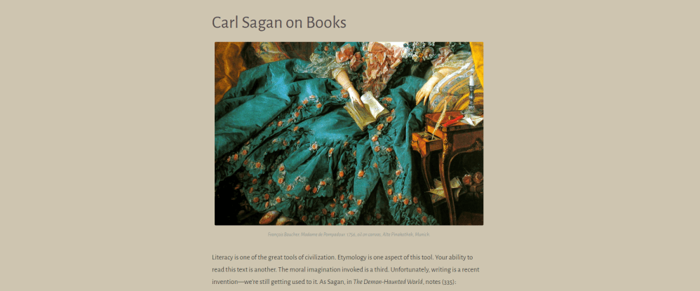 Sagan makes it very clear. Not only should we read, we must. Literacy is not only an entertaining exercise—it’s education. Through reading, we can acquire the laws of the cosmos and nature—at least, what we theorize those laws to be. We also acquire moral laws by which we must abide, laws regarding charity and community. In other words, literacy is the key to cultivating beautiful minds, and from there a beautiful world.
