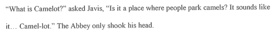 Javis hits the bar and gets drunk. It’s very important to ten-year-old-me that I include the names of the drinks. Mad Dog Ale, Crossbow Corner Mead, Dragon’s Milk. Javis puns on each of these names, telling the bartender to “give me a bite,” “give me a shot,” and “give me a hot squirt.”