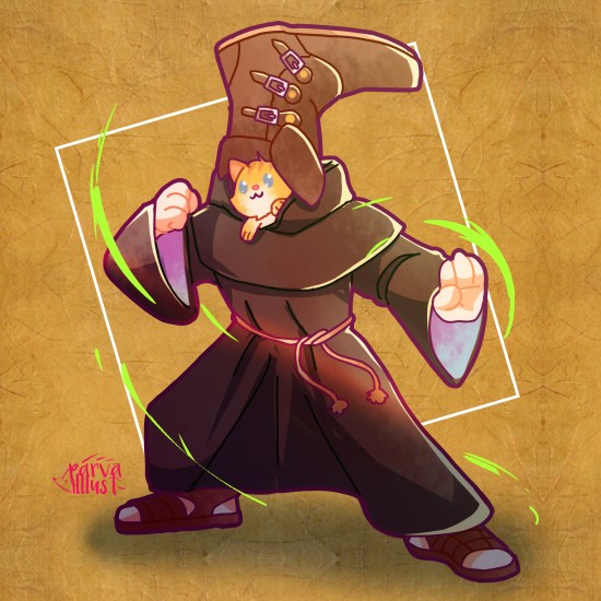 Without a description of Boots, I’ve decided that he’s just a normal-looking Monk who wears a boot on his head.