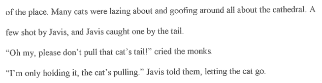 The book is a very poor amalgamation of Arthurian legend, Tolkien’s Lord of the Rings, 90s pop culture, a ten year-old’s love of cats, and puns.