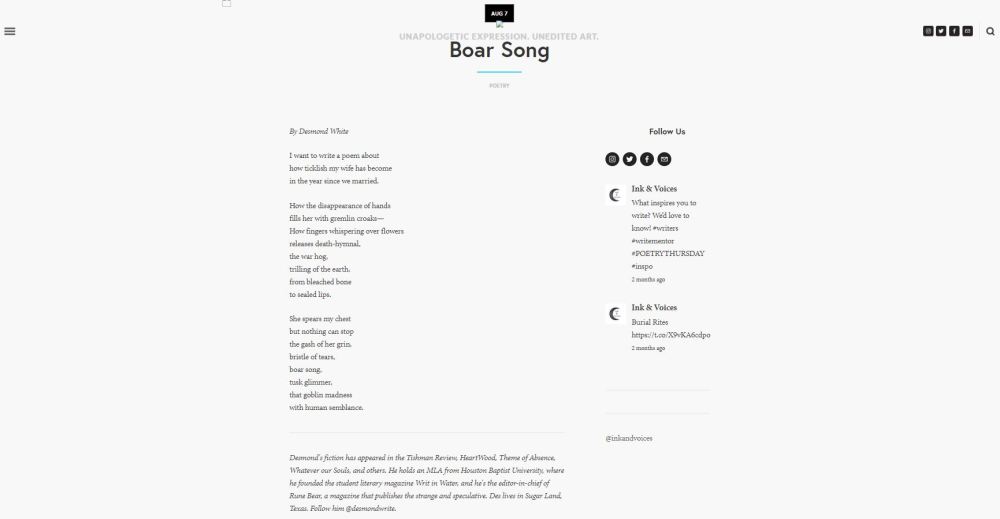 My poem, “Boar Song” published in Ink & Voices, an online publication devoted to “unapologetic expression, unedited art.” The magazine seeks to provide a space for “humanness” and has a predilection for the “honest, raw, and original.” Meanwhile, my poem, about my wife who turns goblinesque when I tickle her, was an attempt to express my adoration without praise-filled language.